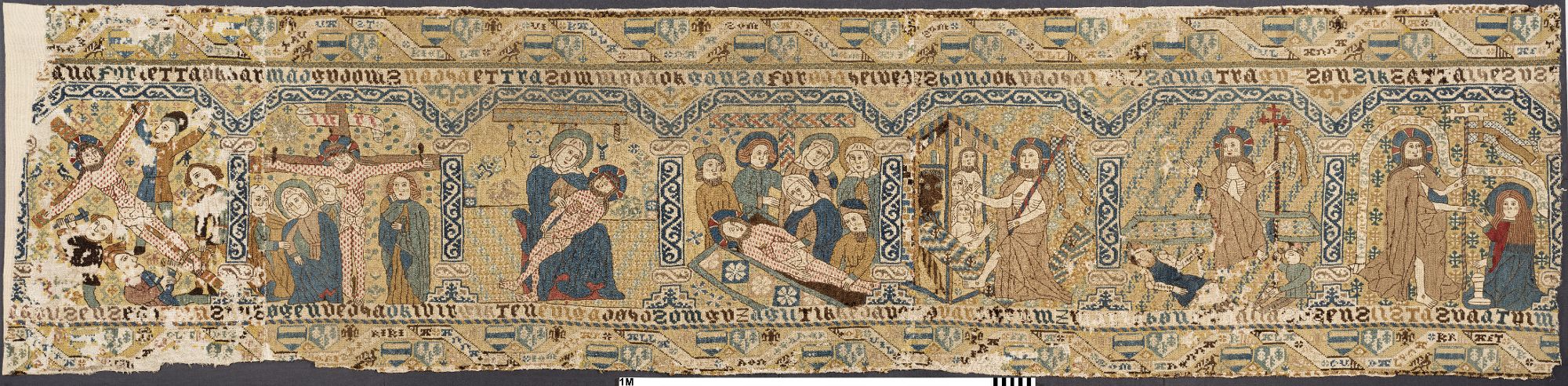 Kuvassa kuorikaapu, jossa on kaunista koristelua. Koristelu on tehty silkki-ja kultalangalla Englannissa 1400-luvulla.